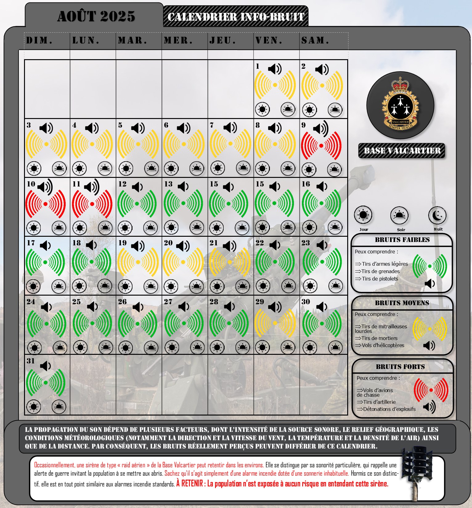 Veuillez trouver ci-dessous le calendrier Info-Bruit indiquant l’intensité des bruits émanant des secteurs d’entraînement de la Base Valcartier pour le mois d'août 2025.