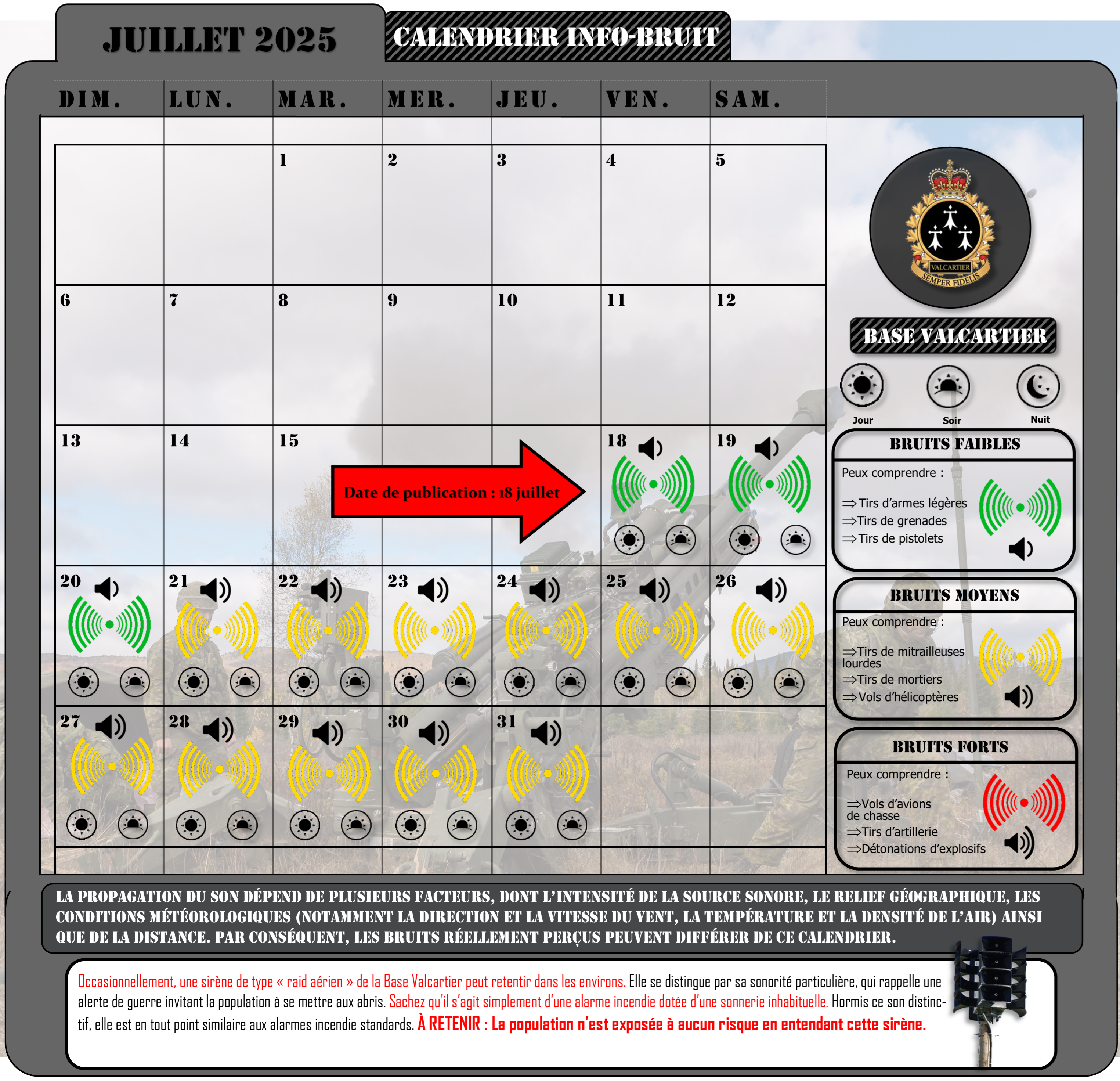 Veuillez trouver ci-dessous le calendrier Info-Bruit indiquant l’intensité des bruits émanant des secteurs d’entraînement de la Base Valcartier pour le mois de juillet 2025.