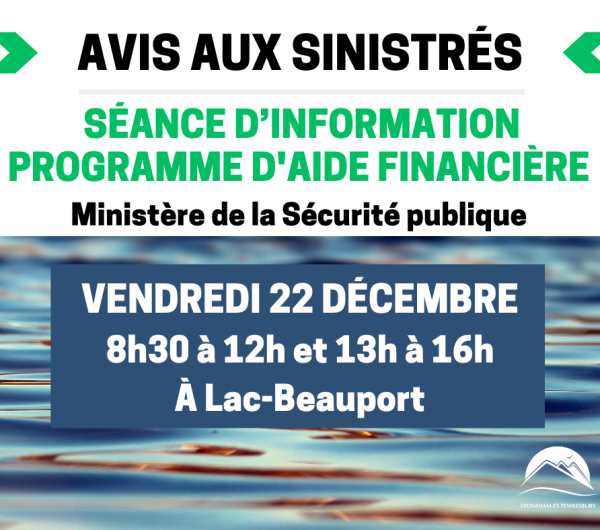 🔸En tant que SINISTRÉS DE STONEHAM-ET-TEWKESBURY, VOUS ÊTES LES BIENVENUS à Lac-Beauport pour rencontrer les analystes du MSP.