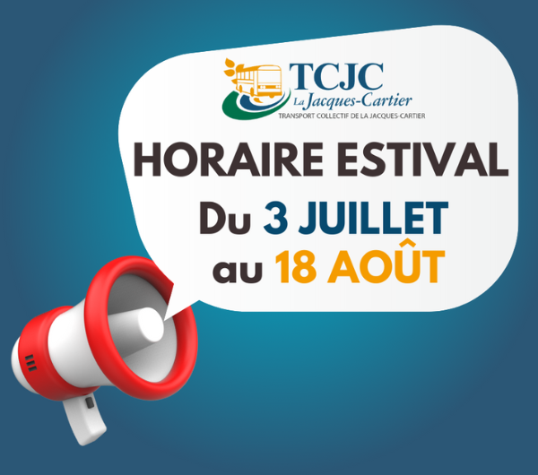 Dès le 3 juillet prochain, le Transport collectif de La Jacques-Cartier (TCJC) passe en mode estival. Du même coup, le TCJC offre un accès gratuit à l’ensemble de son réseau pendant tout l’été, soit pour les mois de juillet et d’août.