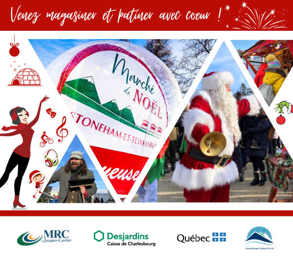 Stoneham-et-Tewkesbury, le 30 novembre 2023 – Le marché de Noël de la municipalité des cantons unis de Stoneham-et-Tewkesbury ouvrira ses portes demain soir, vendredi 1er décembre 2023 à 17h pour six jours de festivités répartis sur deux fins de semaine !
